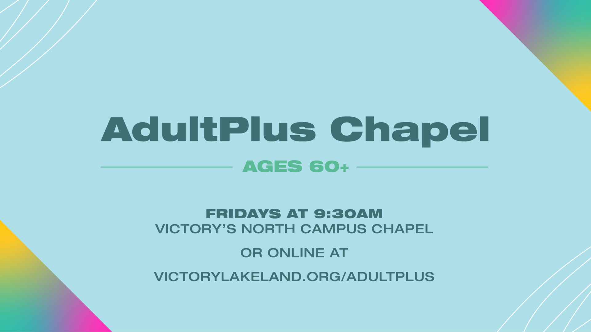Also, join us every Friday, at 9:30 AM, at our North Campus for our weekly chapel service, or view online and stay up to date with AdultPlus news and information by visiting victorylakeland.org/adultplus.