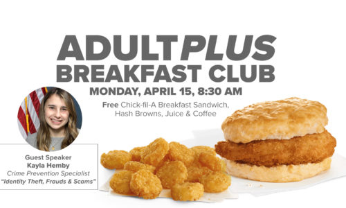 Those 60+ are invited to join the AdultPlus group for an informative and FREE breakfast on Monday, April 15, from 8:30-9:45 AM, in room 116 of the Family Life Center at Victory’s North Lakeland Campus. Learn about about identity theft, fraud, and scams and how to navigate the internet and the digital world safely.