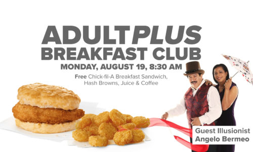 Those 60+ are invited to this month’s AdultPlus Breakfast Club happening Monday, August 19, from 8:30-9:45 AM, and features illusionist Angelo Bermeo.