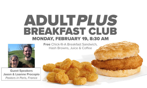 Those 60+ are invited to join the February AdultPlus Breakfast Club to hear Jason & Loanne Procopio, pastors of Eglise Connexion in Paris, France, share their story about God's amazing faithfulness in room 116 of the Family Life Center at Victory's North Lakeland Campus from 8:30-9:45 AM.