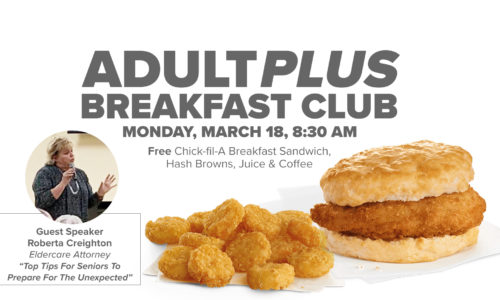 Those 60 & up are invited to join the AdultPlus group for an informative and free breakfast featuring Eldercare Attorney Roberta Creighton, speaking on the subject “Top Tips For Seniors To Prepare For The Unexpected," on Monday, March 18 at 8:30 AM.