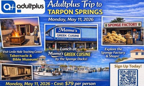 AdultPlus is taking a trip to Tarpon Springs on Monday, May 11, 2026. The cost is $79 per person. We'll meet at the church at 7:30 AM to board the bus and will be back at the church at 5 that evening.
