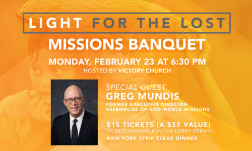 Our annual Light for the Lost missions banquet is coming up on Monday, February 23, at 6:30 PM! This unique evening is an opportunity for you to hear a powerful update of what God is doing around the world from guest speaker, Dr. Greg Mundis.