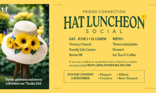 If you are a widow or would like to be a friend to a widow, you are invited to join us on Saturday, June 1, at Victory's North Campus Family Life Center, room 116, for a fun luncheon and hat event from 12 noon to 1:30 PM.