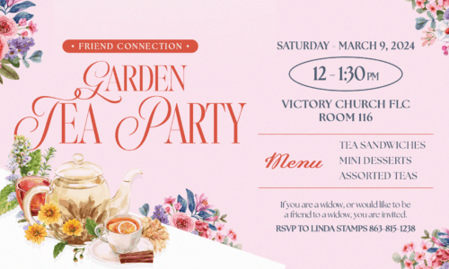 If you are a widow or would like to be a friend to a widow, you are invited to join us on Saturday, March 9, at Victory's North Campus Family Life Center, Room 116, for a Garden Tea Party from 12 noon to 1:30 PM.