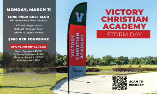 Victory Christian Academy invites you to be part of the next Annual “Storm Day” at Lone Palm Golf Club on Monday, March 11, at 7:30 AM. The day will be full of fun and great food as you’ll enjoy a continental breakfast, on-course games, and an incredible lunch featuring Lone Palm’s famous shrimp and short ribs, all at one of Florida’s top private clubs.