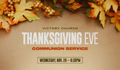 Join the entire Victory family at our North Campus on Wednesday, November 26, at 6:30 PM, for a special one-hour Thanksgiving Eve communion service. All children, youth, and adult activities are canceled so everyone can participate. Dress casually and invite your friends and family for this special communion experience.
