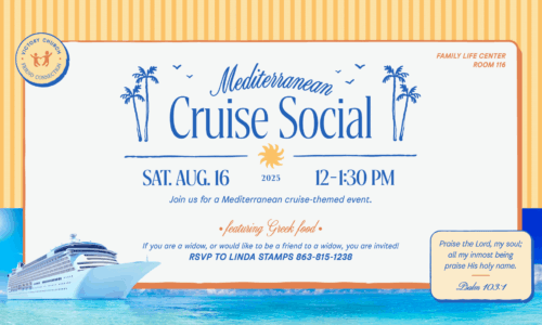 If you are a widow or would like to be a friend to a widow, you are invited to join us on Saturday, August 16, at Victory's North Campus Family Life Center, room 116, for a Mediterranean Cruise-themed event from 12 noon to 1:30 PM. We'll enjoy delicious Greek food while having a great time together.