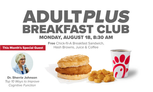 Those 60+ are invited to this month’s AdultPlus Breakfast Club on Monday, August 18, from 8:30-9:45 AM, in room 116 of the Family Life Center. Come enjoy a delicious FREE Chick-fil-A breakfast, the opportunity to connect with some great people, and to learn “The Top 10 Ways to Improve Cognitive Function,” taught by Dr. Sherrie Johnson.