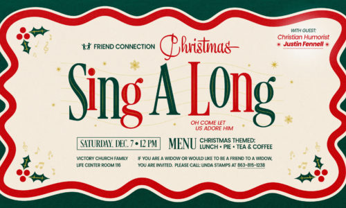 If you are a widow or would like to be a friend to a widow, you are invited to join us on Saturday, December 7, at Victory's North Campus Family Life Center, room 116, for a fun luncheon and Christmas party sing-along from 12 noon to 1:30 PM.