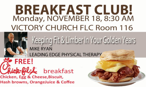 Those 60+ are invited to this month’s AdultPlus Breakfast Club happening Monday, November 18, from 8:30-9:45 AM, in room 116 of the Family Life Center at Victory’s North Lakeland Campus. Enjoy a delicious FREE Chick-fil-A breakfast meal and an informative session by Mike Ryan from Leading Edge Physical Therapy entitled "Keeping Fit & Limber in Your Golden Years."